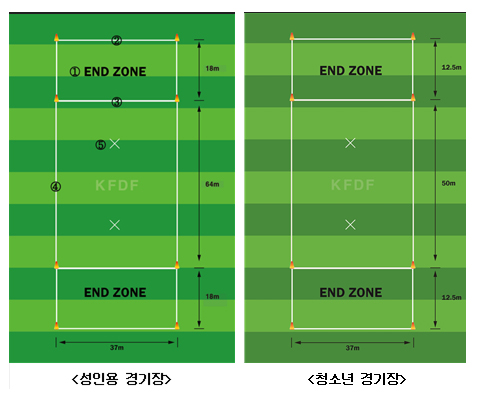| 얼티미트 경기장은 성인용 경기장과 청소년경기장으로 구분된다. 국제경기장(정식규격)은 7인제, 길이 100m, 폭 37m 크기이며, 길이 18m, 폭 37m 크기의 2개의 엔드 존이 구성된다. 얼티미트 경기는 실내에서 축소하여 미니게임도 가능하지만, 안전 목적상 실외에서 실시하는 것이 좋다. 청소년 경기장은 길이 75m, 폭 37m 규격의 경기장에서 진행되며, 지역대회는 여건에 따라 5인제, 56m, 폭 32m 규격을 사용한다. ⓵ ‘엔드존’으로 경기 시작 위치, 상대편 엔드 존에 들어가 패스를 받으며 득점한다. ⓶ ‘엔드 라인’으로 엔드 존의 바깥쪽 라인을 말한다. ⓷ ‘골 라인’으로 엔드 존의 안쪽 라인을 말한다. ⓸ ‘사이드 라인’으로 경기장 양쪽 측면 라인으로 OB지역 구분한다. ⓹ ‘브릭 마크’로 엔드존 아웃, 사이드라인 아웃 등의 경우 공격할 수 있는 지점을 말한다. |